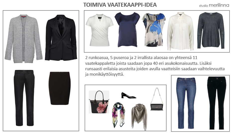 Tässä oli vain muutama esimerkki asukokonaisuuksista. Eli todella pienellä vaatemäärällä saa hyvinkin erityyppisiä asukokonaisuuksia, kun huomioi tyylin, värit, käyttötarkoituksen ja etenkin asustamisen. Kun vaatteet ovat laadukkaita, hyvistä materiaaleista valmistettuja, ovat ne pitkäikäisiä ja niistä nauttii aivan eritavalla kuin halvoista herätehankinnoista, jotka loppujen lopuksi saattavat päätyä vain kaapin täytteeksi aiheuttaen mielipahaa. Oikeanlaiset vaatteet ovat siis jopa osa tasapainoista hyvinvointiamme!