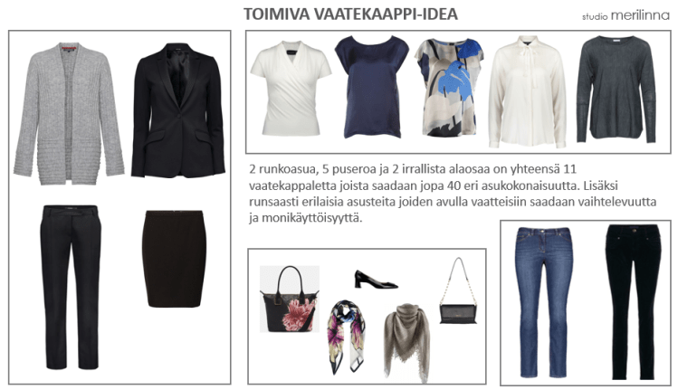 Taitavilla hankinnoilla yhteen puvustoon saadaan kuitenkin mahtumaan esim. asu casuaalia, rentoa pukeutumista vaativaan tilanteeseen, asu muodolliseen bisnespukeutumiseen, asu smart casual-etikettiä noudattavaan tilanteeseen, sekä asu after work -tyyppiseen coctailtilaisuuteen. Kaikki nämä saadaan yhdentoista vaatekappaleen puvustosta, joka kaiken lisäksi vie todella vähän kaappitilaa!