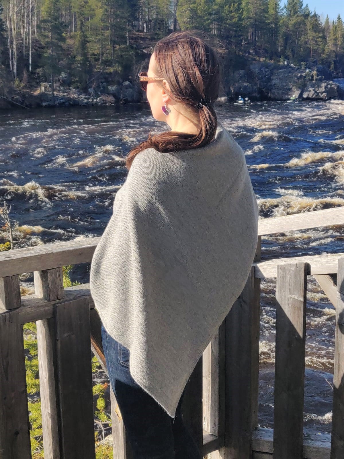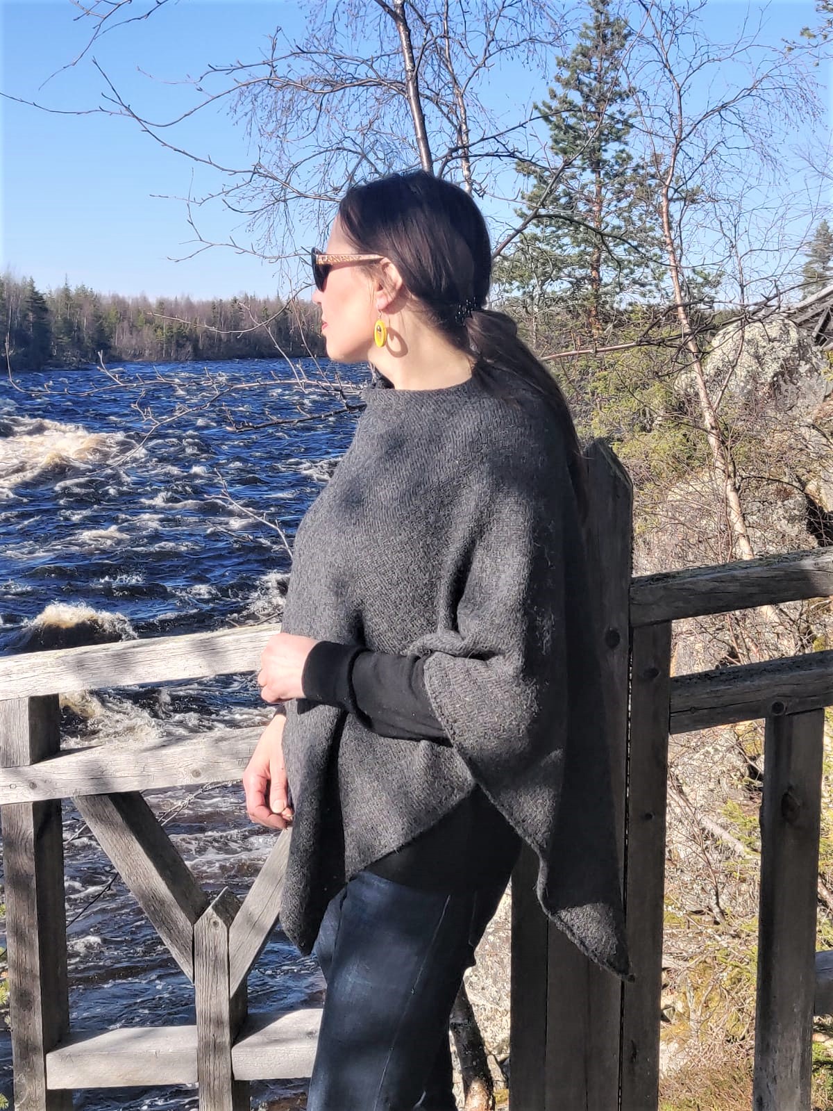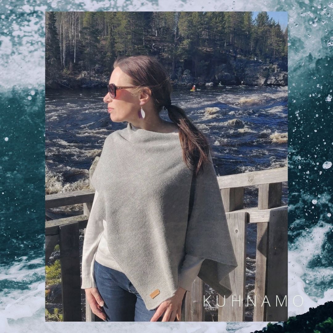 Pikku Kota on nimensä mukaisesti hieman pienempi versio suuremmasta Kota hartiaviitasta. Sen vino linja edessä ja takana on hyvin vartaloystävällinen, peittää juuri sopivasti, mutta jättää kädet vapaaksi. Kuvissa olevat Nuppu-korvakorut ovat myös Kuhnamo-mallistoon kuuluvia. Korvakorut valmistetaan ylijäämänahasta täysin käsityönä.